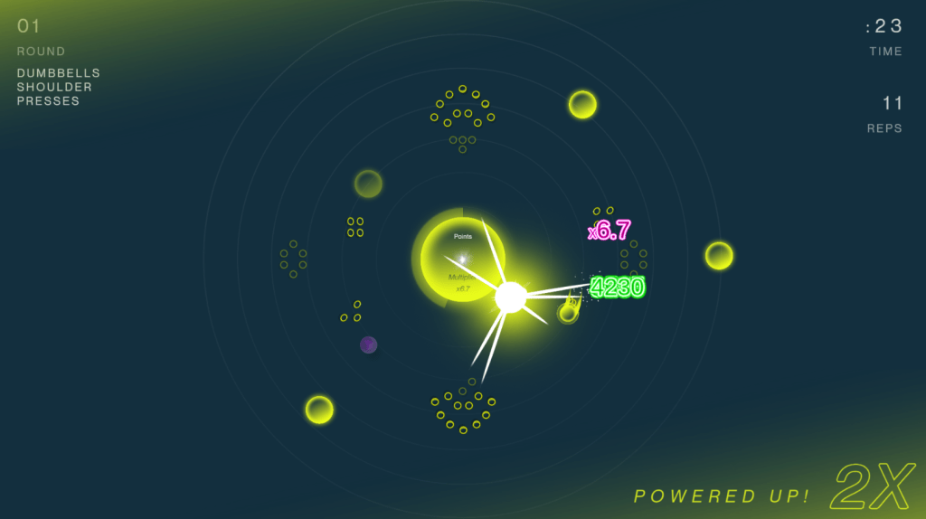 Players were intended to experience scenarios optimized to provide challenge and entertainment in addition to respecting screen attention deficits caused by exercise itself. In Orbital, the level design methodology was based on rewarding players for each successive rep made in a median tempo, and also their ability to apprehend, calculate, and respond to the collectibles and pitfalls arranged upon the game map. These game objects were spawned in waves, which gave players ever-changing points of focus in the game space. Just when spare rings were becoming more difficult to hit, new clusters would then appear, giving the impression of progression and giving new players new second-to-second goals.